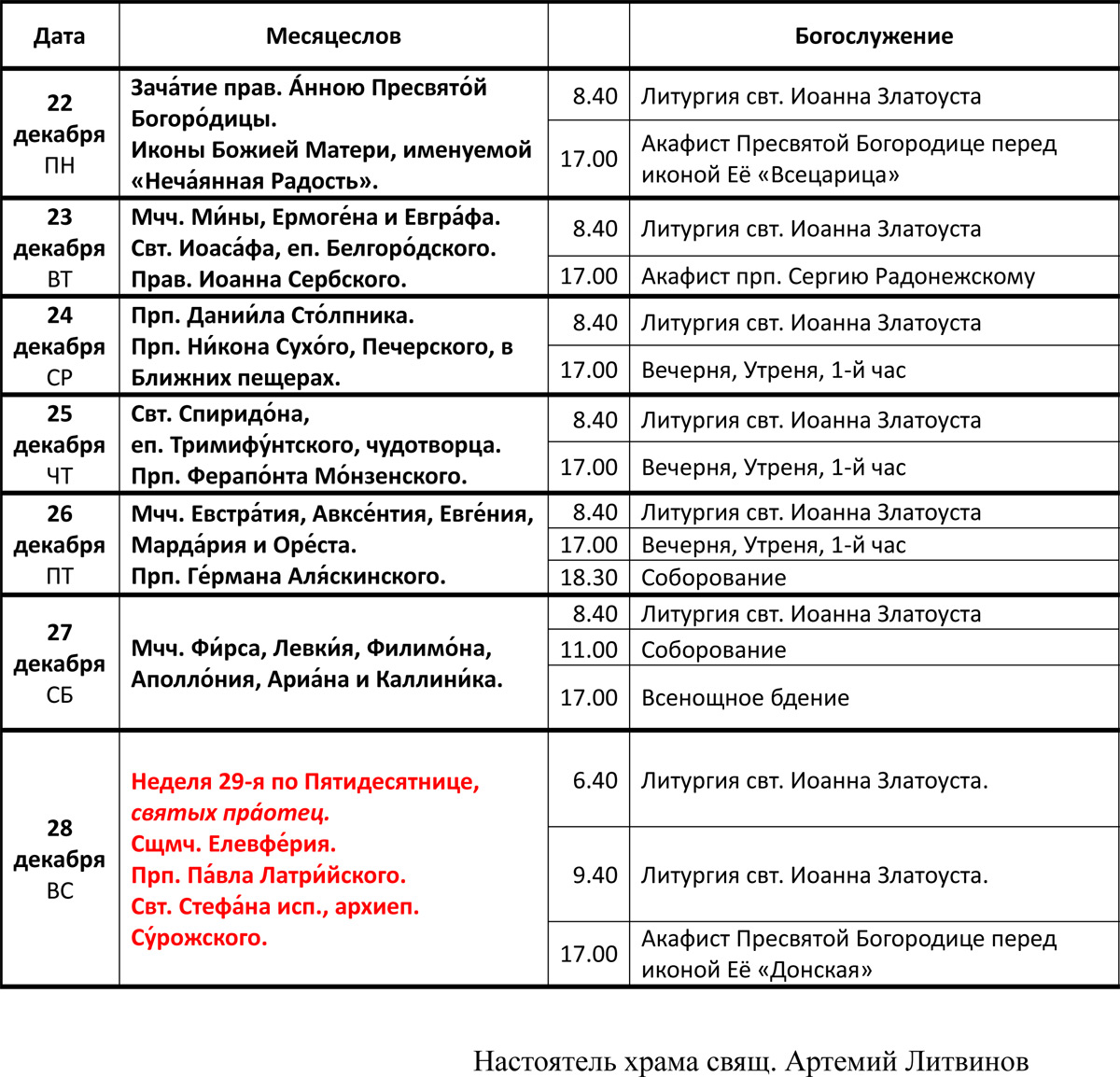 РАСПИСАНИЕ БОГОСЛУЖЕНИЙ 22 - 28 ДЕКАБРЯ 2025 ГОДА