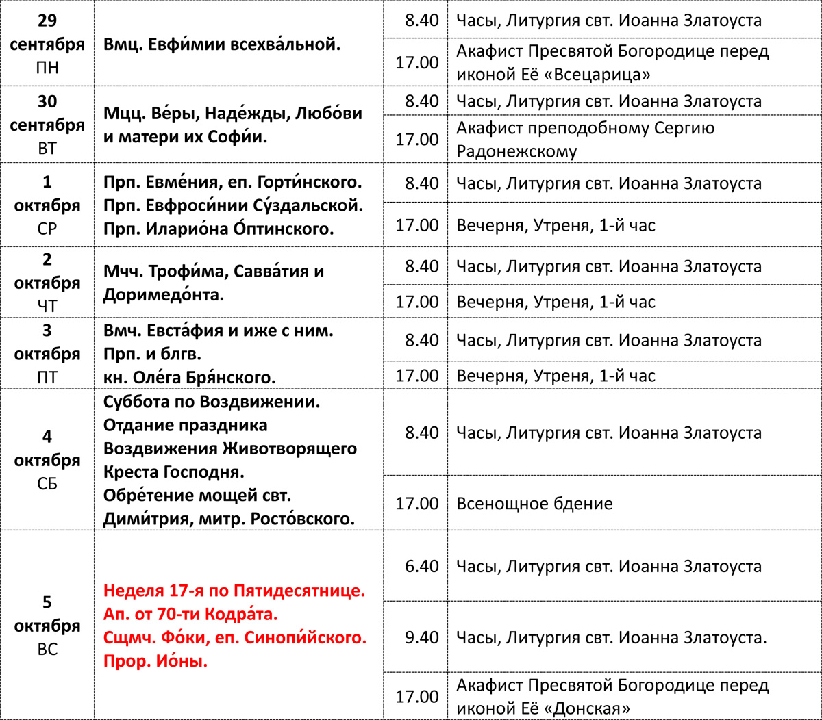 РАСПИСАНИЕ БОГОСЛУЖЕНИЙ 29 СЕНТЯБРЯ - 5 ОКТЯБРЯ 2025 ГОДА