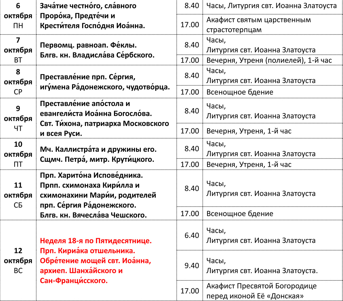 РАСПИСАНИЕ БОГОСЛУЖЕНИЙ 6 - 12 ОКТЯБРЯ 2025 ГОДА